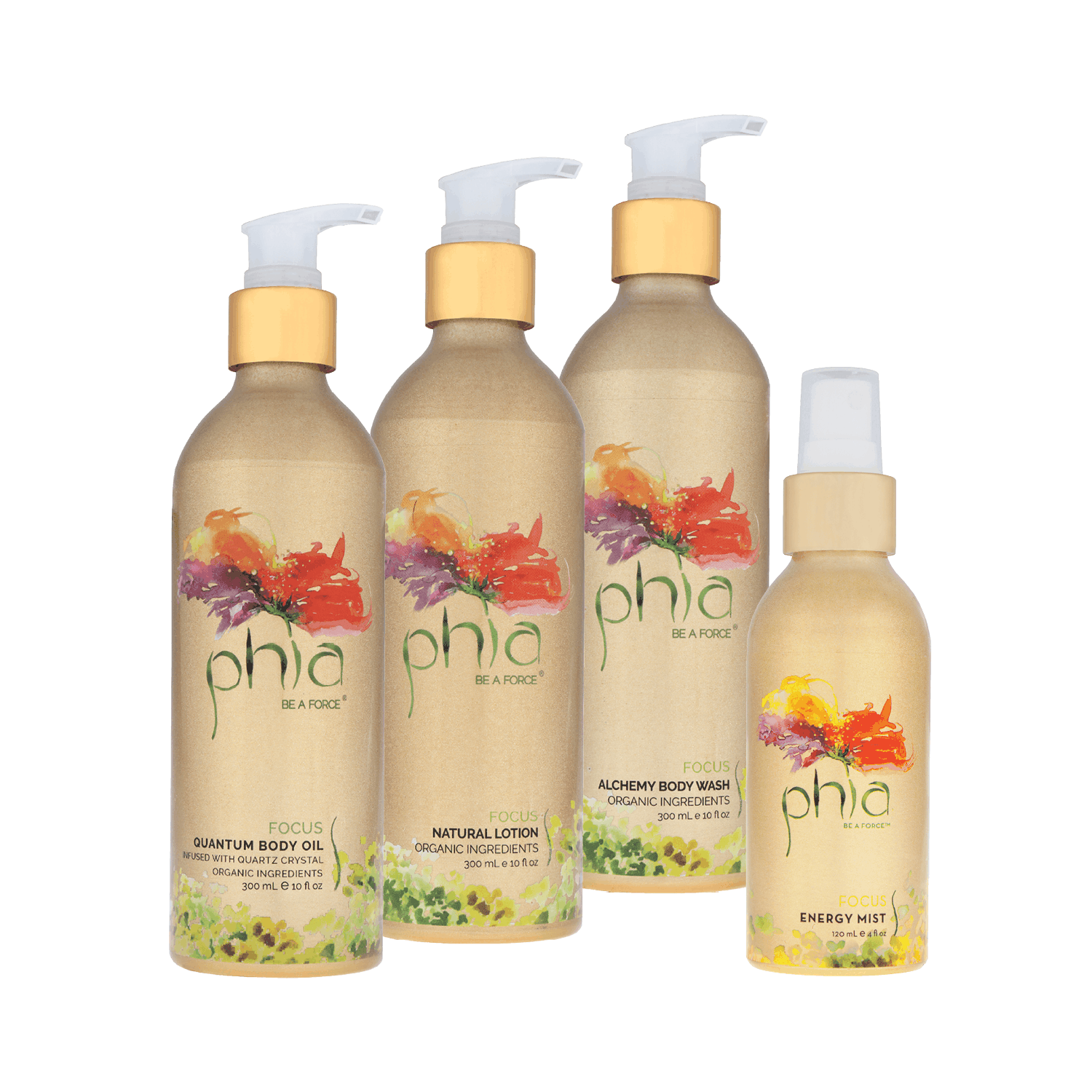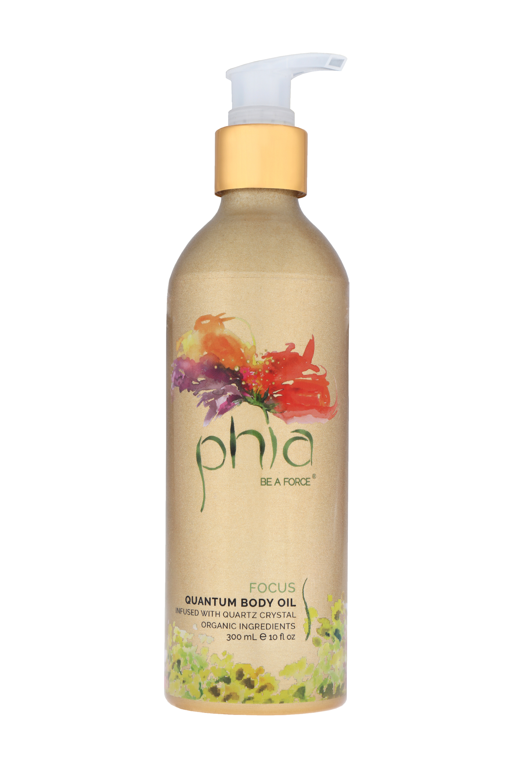 Quantum Body Oil (10 fl oz / 300 ml) — This crystal infused blend of Moroccan argan, coconut, avocado and jojoba oils deeply moisturize and soften skin. Inspired by the principles of quantum mechanics, Phia Body Oil connects you to the infinite forces of nature.