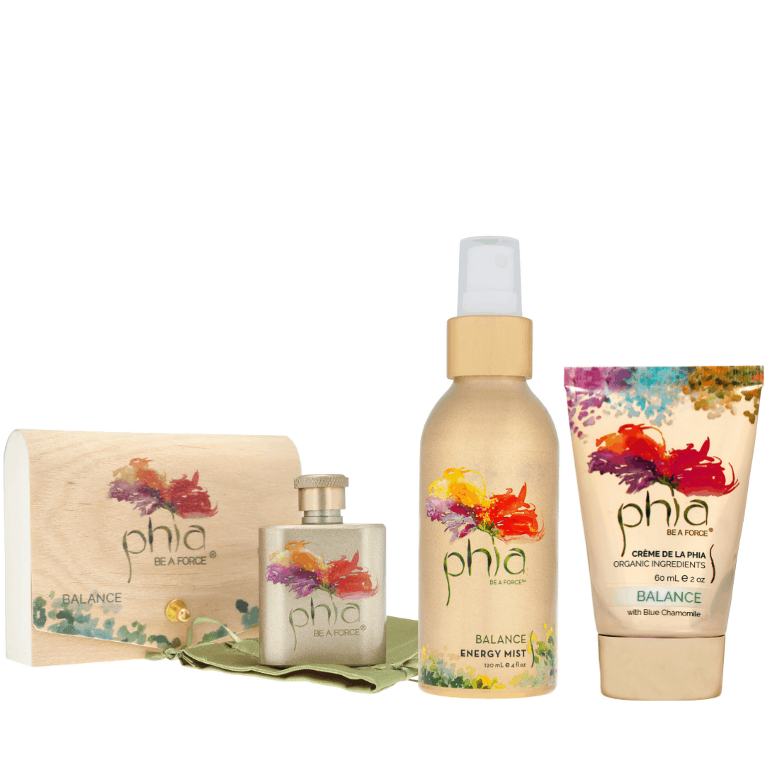 Energy Bouquet — Cocos Nucifera (Coconut) Oil*, Simmondsia Chinensis (Jojoba) Seed Oil*, Tocopherols (Vitamin E), Plant, Flower and Herb Essences, Gem Elixirs. *Organic — Crème de la Phia — Helianthus Annuus (Sunflower) Seed Oil, Soja Hipsida (Soybean) Oil, Deionized Water, Natural Beeswax, Sodium Borate, Aloe Barbadensis (Aloe) Leaf Juice*, Chamomilla Recutita (Matricaria) Flower Extract (Camomile), Phenoxyethanol, Caprylyl Glycol (Optithen), Plant, Flower and Herb Essences, Gem Elixirs. *Organic — Energy Mist — Distilled Water, Aloe Barbadensis (Aloe) Leaf Juice*, Argania Spinosa (Argan) Nut Oil*, Persea Gratissima (Avocado) Oil*, Leontopodium Alpinum (Edelweiss) Flower Extract*, Tocopherols (Vitamin E), Plant, Flower and Herb Essences, Gem Elixirs. *Organic