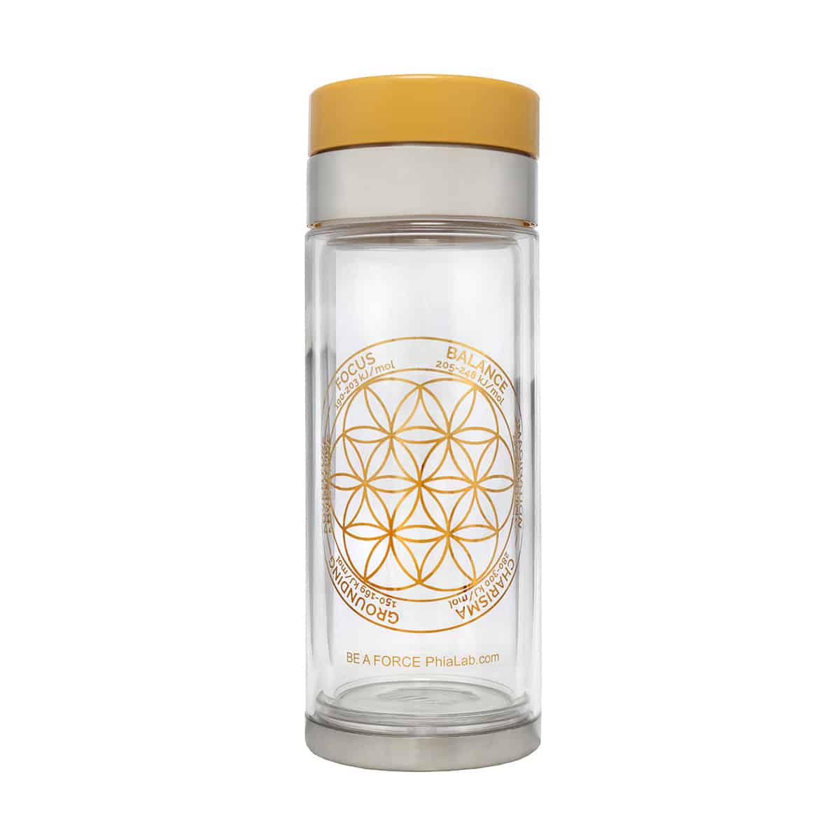 Energy Bouquet 21ml metallic gold stainless steel flask Crème de la Phia 2oz gold ABL tube Organic Loose Leaf Tea 5oz gold aluminum tin Wellness Tea Infuser 12.85 oz BPA-Free Poly Exterior / Glass Interior