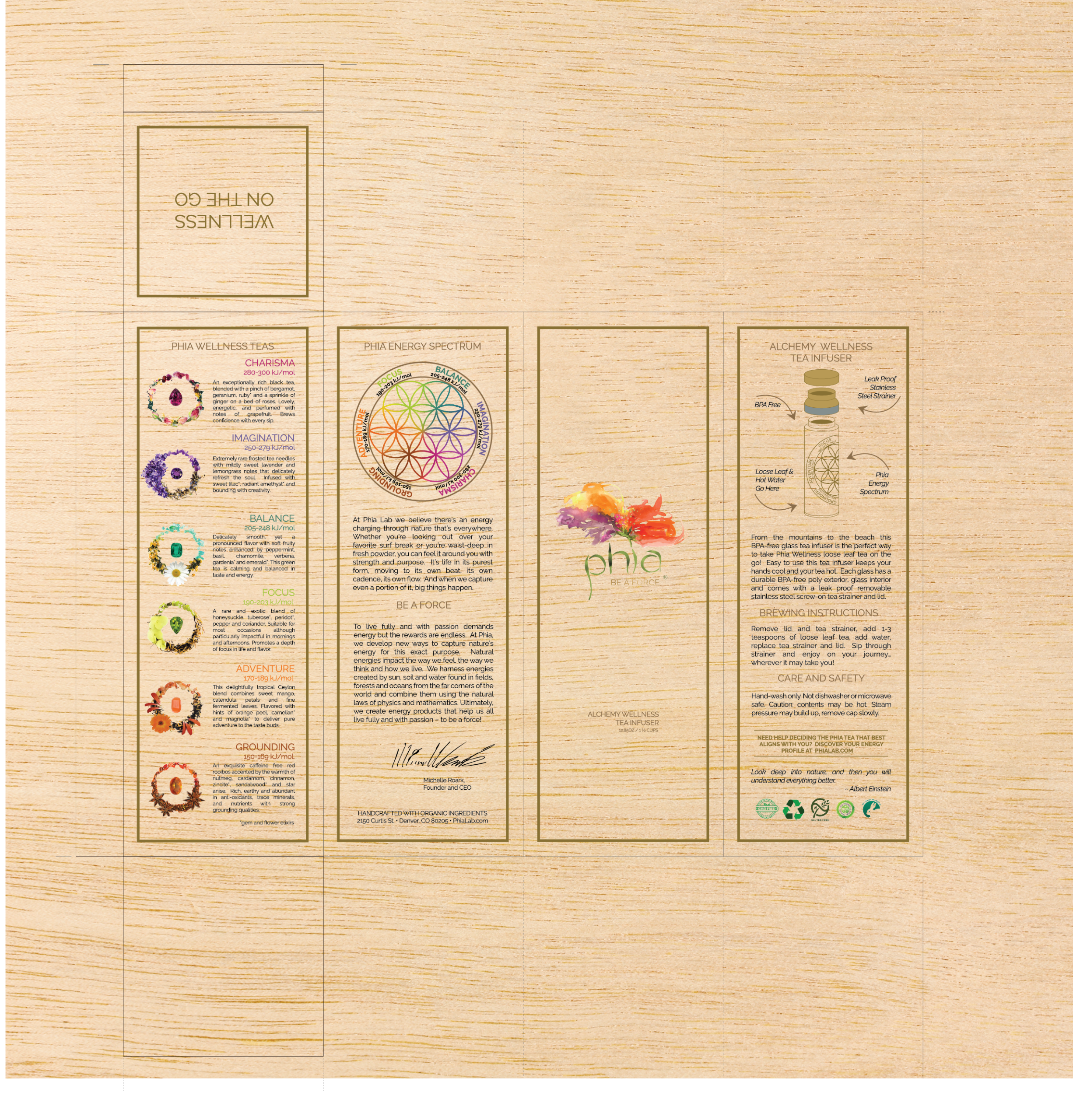 Organic Loose Leaf Tea (5 oz) — Created to complement our energy products, Phia Wellness Teas extend the energizing experience of Phia throughout the day. The Tea selection consists of six Bouquets that align with the Phia Energy Spectrum. Teas are made from the finest organic ingredients and are infused with gem and flower elixirs.