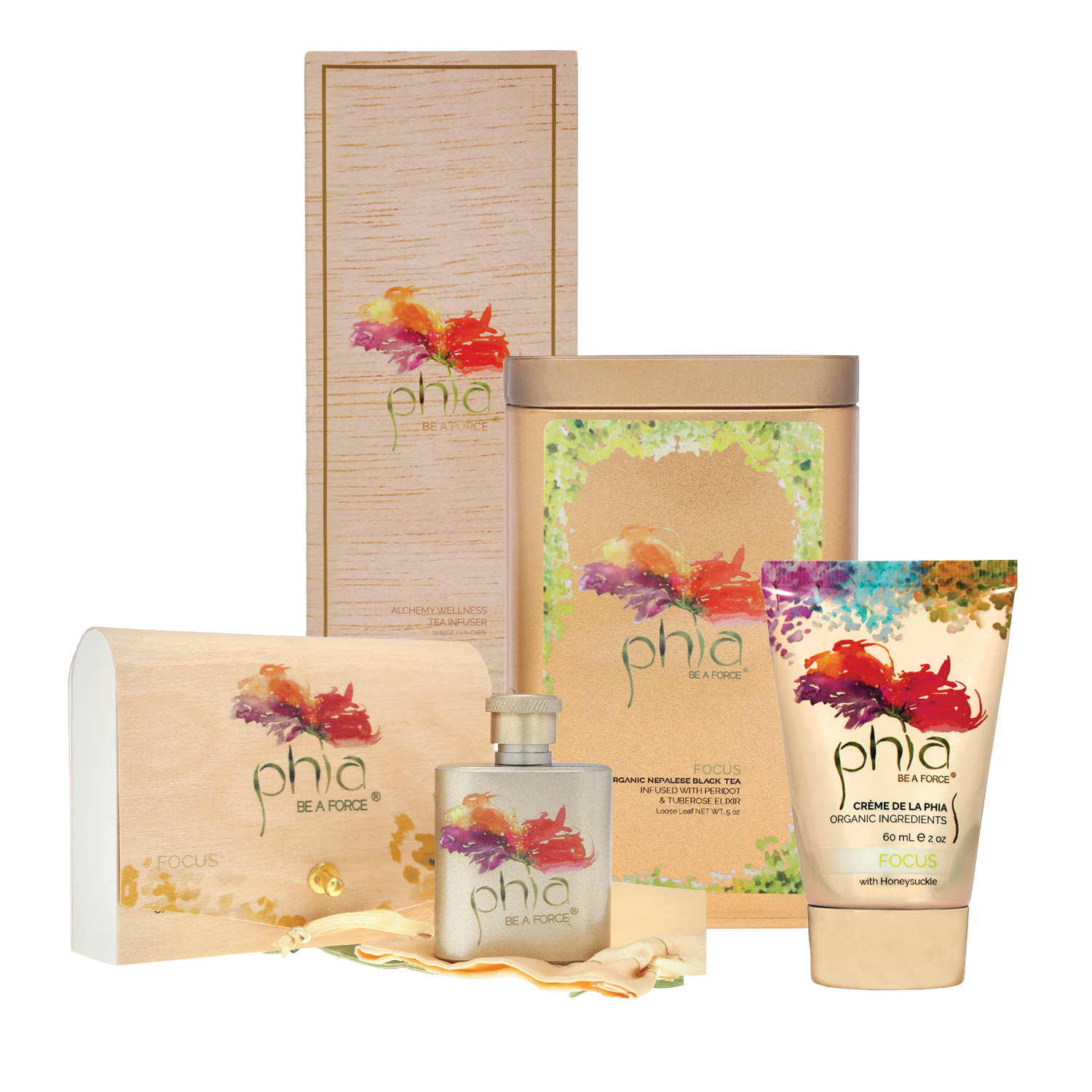 Energy Bouquet 21ml metallic gold stainless steel flask Crème de la Phia 2oz gold ABL tube Organic Loose Leaf Tea 5oz gold aluminum tin Wellness Tea Infuser 12.85 oz BPA-Free Poly Exterior / Glass Interior